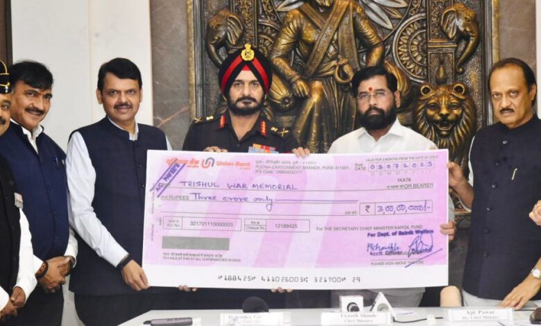 मुंबई : लडाख येथील त्रिशूल युद्ध स्मारकाच्या दर्जोन्नतीसाठी महाराष्ट्र शासनाच्यावतीने तीन कोटी रुपयांचा धनादेश आज कारगिल विजय दिनानिमित्त मुख्यमंत्री एकनाथ शिंदे यांच्या हस्ते लेफ्टनंट जनरल एच. एस. कहलोन यांना सुपूर्द करण्यात आला. यावेळी उपमुख्यमंत्री देवेंद्र फडणवीस, उपमुख्यमंत्री अजित पवार यांच्यासह सार्वजनिक बांधकाम मंत्री दादाजी भुसे, मदत व पुनर्वसन मंत्री अनिल पाटील, आमदार श्रीकांत भारतीय आदी उपस्थित होते. विधिमंडळातील मुख्यमंत्र्यांच्या समिती कक्षात हा कार्यक्रम झाला.